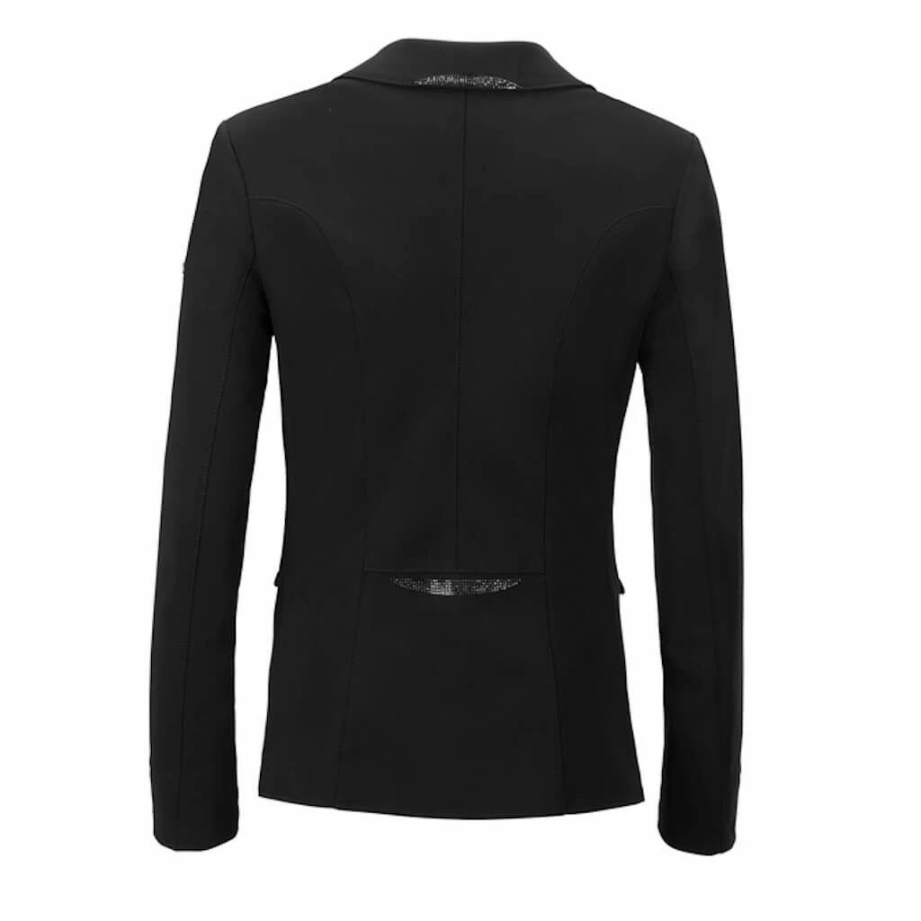 The chic jacket Isalinne by Pikeur and is ideal for the tournament outfit of young female riders. It is made of a tech jersey functional fabric with a 4-way stretch and ensures maximum comfort. It is made of synthetic materials, which makes it very durable, quick drying and easy to clean. The slim cut is figure-hugging and the elastic fabric allows for a well-fitting and comfortable fit. The sleeve length is additionally extendable up to 5 cm. Chic details such as the discreet rhinestone applications on the flap pockets, as well as other noble details are found on the collar insert and in the waist area on the back again.