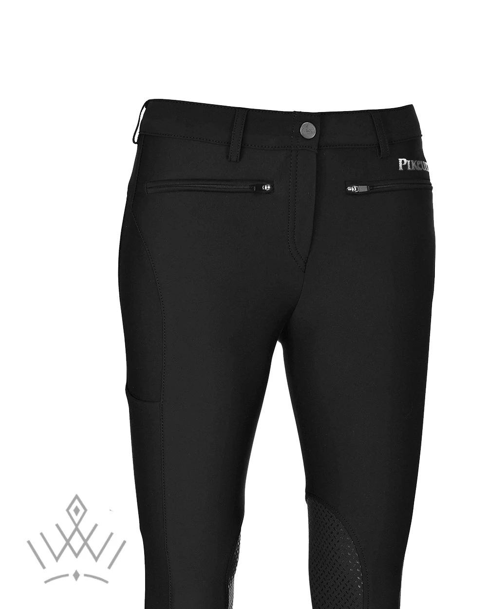 Pikeur Tessa Knee Grip Ladies Breeches. These comfortable breeches feature a mid waist fit with a useful integrated mobile phone pocket on the right leg, two front zipped pockets and grip knee patches.