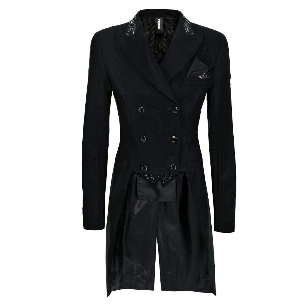 The noble women tailcoat Lilien by Pikeur convinces not only by its appearance, but also by many material properties. Through changeable corners and tuck-in cloths, you can customize the tailcoat to any riding outfit. The collar and waist belt have rhinestone appliqués, which together with the eyelet buttons on the center front and sleeves give the tailcoat a particularly classy look. A tailored cut and the use of breathable softshell fabric ensure a comfortable fit. A slim sleeve width, a wide facon and the bi-elastic and breathable fabric allow for the best possible wearing comfort. The light weight tailcoat completes every show outfit and is the ideal companion in demanding tests.